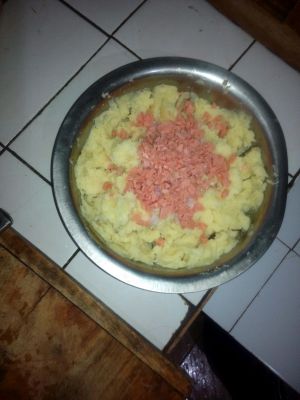 将备用的西兰花,红椒,青椒,肉肉,蒜末倒入土豆泥中,加少许盐,生抽,面粉。