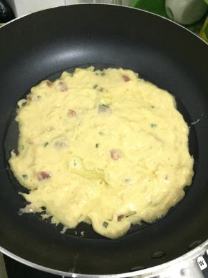 加少许水拌起来!!!然后剪葱花跟腊肠进去,更加香口。