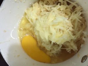 土豆擦丝,洋葱切粒,加蒜泥,黑胡椒,盐,糯米粉,面粉,咖喱拌匀。