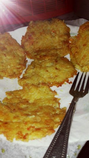 只是尝试做,没想到好吃,没拍步骤,用文字记录,下次再做。然后是手握一团放热油热锅里煎,刚煎时先不用铲子动它,表面裹了油再用铲子压平,绝对不沾铲子。
