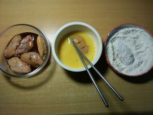 鸡蛋打散备用、炸粉和面包糠分别放在两个碗里,备用