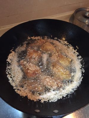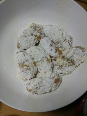 取出后,控干水分,加入淀粉均匀的裹上,放入油锅中炸,炸至金黄色取出