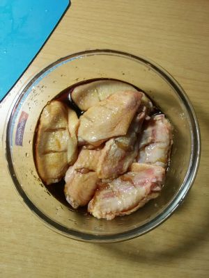 把鸡翅清水清洗干净,用刀拦几刀或者用牙签扎几下,放在小盆里,在盆里放入料酒,生姜,酱油,生抽,胡椒粉,腌制1个小时,主要是去除鸡翅的血水味!一个小时后把多余的水分倒出放入鸡翅腌料(超市都有卖)。腌制2小时,时间久也没有关系!