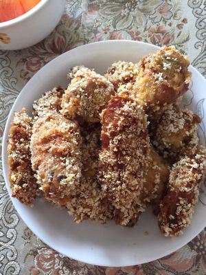 把裹完鸡蛋液的鸡翅放在面包糠里,裹上面包糠!
