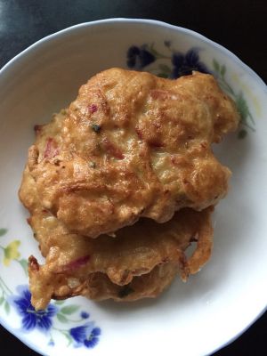 把萝卜切细丝焯一下,挤干水分 胡萝卜火腿切丁(胡萝卜可不放,对味道没影响) 适量面粉加水搅拌均匀成面糊 不用太多,面粉主要起粘连作用
