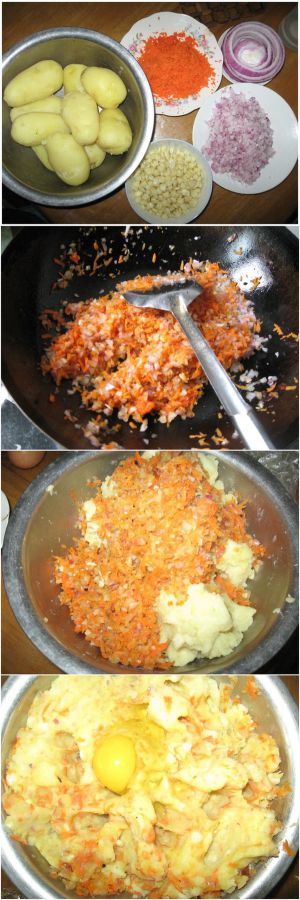 把土豆蒸熟,胡萝卜洋葱切丁,上锅到油,油热了炒胡萝卜丁,变色后再倒入洋葱翻炒。炒好的料倒入土豆泥中,再把玉米粒倒进去,加入盐和胡椒粉,和匀。