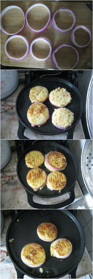 洋葱切成圈,把和匀的土豆泥里再和上点干面粉,使土豆泥不那么稀。然后拍成土豆饼,两面拍上干面粉,做成土豆饼的形状。电饼铛里倒上油,放入洋葱圈和土豆饼,煎至两面金黄即可。