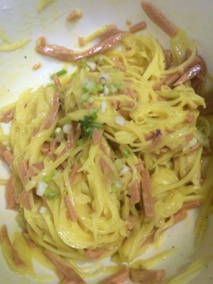 然后加火腿鸡蛋 盐 胡椒 葱