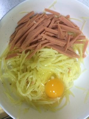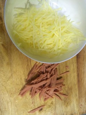 土豆洗净跟火腿肠切丝 土豆泡一会捞出放碗里