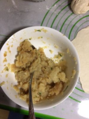 面粉适量加入水,和成面团备用。面放在边上醒,我们可以把土豆泥加调料拌均匀