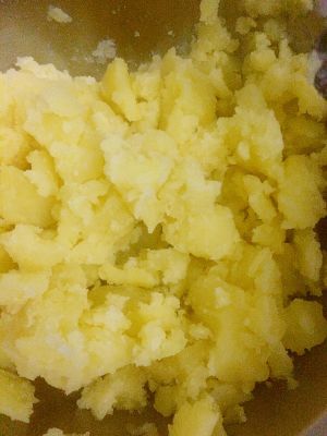 第二步,等土豆蒸好后(用筷子戳戳,心软了就好了)。然后在大碗中弄成泥,用勺子就好。