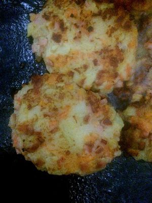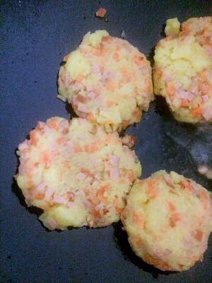 第五步,取出混合好的土豆泥,然后弄成饼状,用手就行,如果没有模具。水加多了会稀,所以一定要注意水。最后外面裹上面包糠。。
