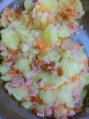 把火腿碎加入土豆泥中,再加一勺淀粉。