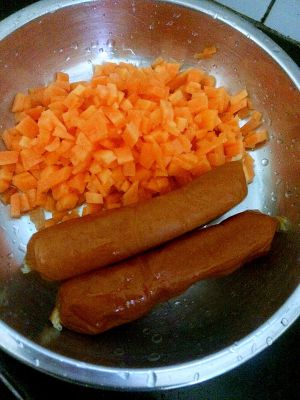 第三步,把生菜和胡萝卜切碎,尽量小。胡萝卜可以用水棹一下,如果不爱吃稍微生一点的。