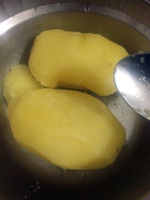 把土豆放凉水冲一下,剥掉皮,然后碾成土豆泥。