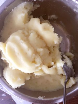3、剥皮后的土豆放入盆子中压成土豆泥,中途加入适量盐