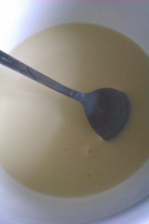 将鸡蛋打散,加入牛奶液中,充分搅拌均匀。