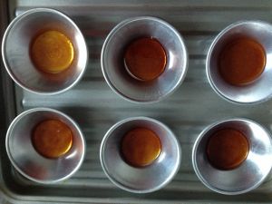 熬好后要迅速倒入布丁模中,很块就结成一块硬糖。
