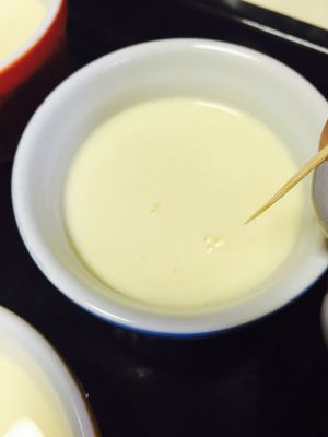 倒入焦糖液的瓶子先放至冷却,等焦糖凝固之后,倒入布丁液。