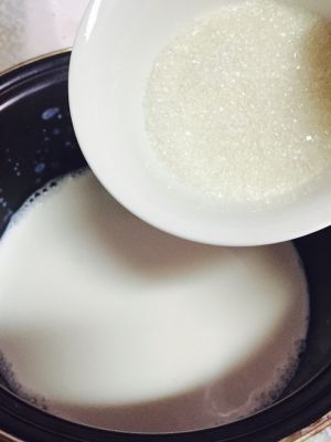 将牛奶倒入锅中,加入砂糖拌匀。拌匀后,煮至微沸,煮的时候要不断搅拌。
