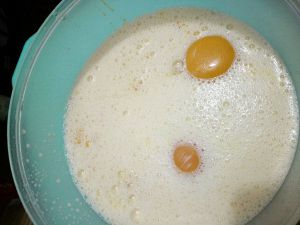 鸡蛋打散,加入牛奶打均匀!