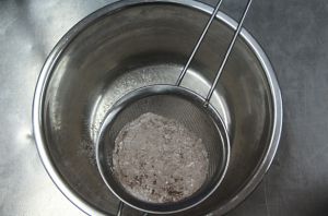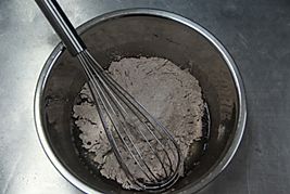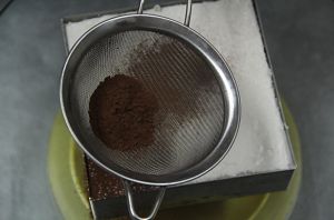 先来制作蛋糕部分:低筋面粉、粟粉、可可粉混合过筛备用