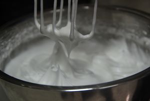 蛋清加入白糖,柠檬汁用电动打蛋器,打发至湿性发泡,拉出有弯弯尖角即可