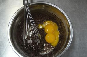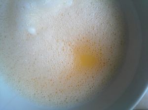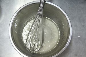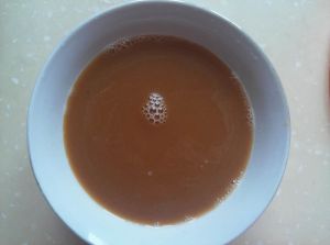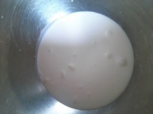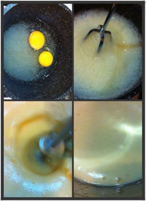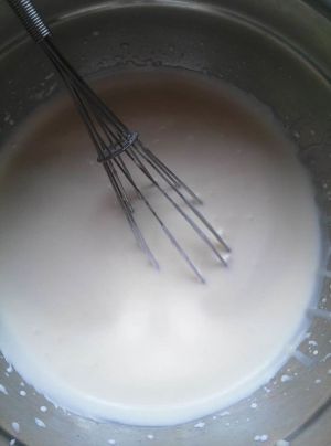 煮开后的步骤4糖水冲入蛋黄中,要不停搅拌,不然就成蛋花汤了