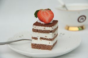 做好的提拉米苏放冰箱冷藏1~3小时,冻好的慕斯面上筛上可可粉,然后切片,用草莓装饰即可