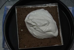 把切好的一片蛋糕放入方形模,倒入三分之一慕斯糊用刮刀抹平,再放一片蛋糕片,再加入慕斯糊抹平(共三层)