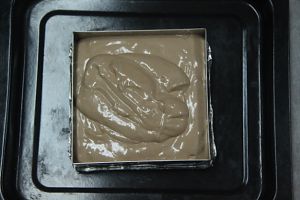 6寸方形模底部用锡纸包好,将拌好的面糊倒入模具中