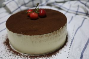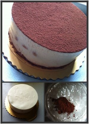 用电吹风稍稍把模具周围吹一圈或者热毛巾捂一圈即可顺利脱模。用比较宽的刀就可以顺利将提拉米苏转移到蛋糕拖上。用筛子轻筛一层可可粉在上面。