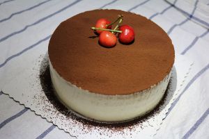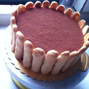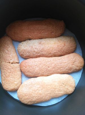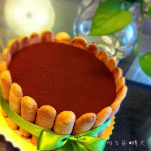 底层铺刷了咖啡酒糖液的手指饼干,然后加入步骤11的混合液,一层手指饼干一层混合液,最后放入冰箱冷藏3个小时,脱模后表层撒可可粉即可