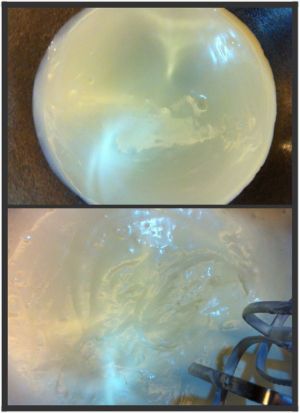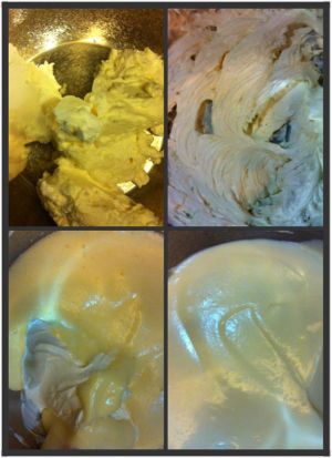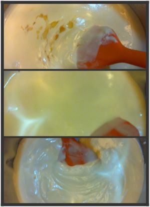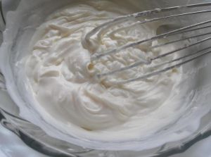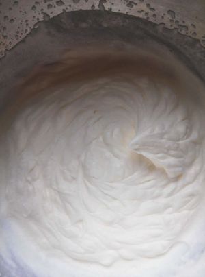 马斯卡彭高速搅拌至顺滑无颗粒状。加入第一步的混合液中拌匀成为奶酪糊。