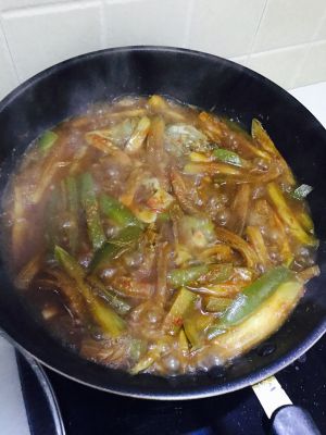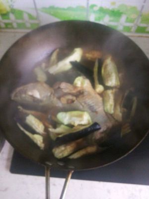 锅底留油,姜蒜爆香,放入大酱,填水,下鱼,依次放入各种调料,最后放茄子,盖锅盖!