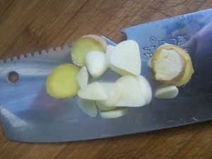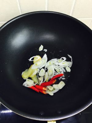 大火烧热炒锅中的油,放入大蒜瓣、老姜片煸炒出香味,放入切好的鲶鱼段,煸至鱼块变成金黄色。