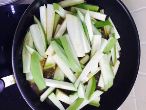 长茄子洗净去蒂,切成大小适中的滚刀块,放入适用于微波炉的盘子中,移入微波炉中,高火加热2 分钟,至茄子块变软取出。