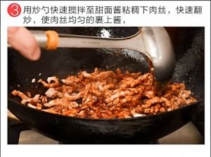 用炒勺快速搅拌至甜面酱粘稠下肉丝,快速翻炒,使肉丝均匀的裹上酱