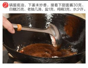 锅留底油,下姜末炒香,接着下甜面酱30克、白糖25克、老抽几滴、盐1克、鸡精3克、水少许
