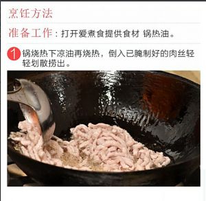 锅烧热下凉油再烧热,倒入已经腌制好的肉丝轻轻散捞出