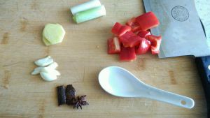 烧一锅水焯肉,烧水间隙准备配料,剥3瓣蒜,切2片姜,2个葱白段,洗2小块桂皮,1个八角,把1小块红椒切成小方块备用,一会用这种瓷汤勺称量糖和酱油