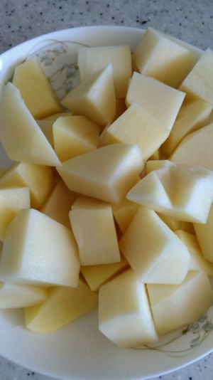土豆去皮切成滚刀块就行,我喜欢方块,所以一般都切成大小适中的方块块,用水稍微冲泡下备用。