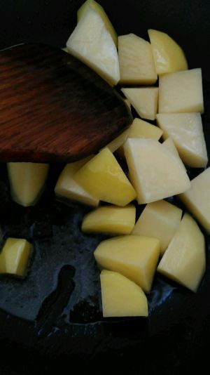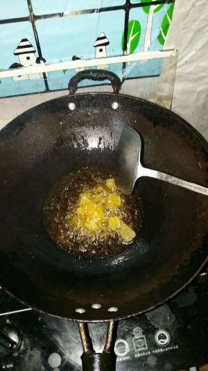 炒锅里加入适量油,根据你的五花肉的肥瘦程度掌握。油热之后把浸水沥干后的土豆块倒进去过一下油再盛出。这样在后面炖的时候土豆不容易碎掉。盛出土豆之后,锅里还有油,这时关到小火,加入2瓷汤勺白糖小火慢熬。等到糖起泡泡的时候把五花肉倒进去。