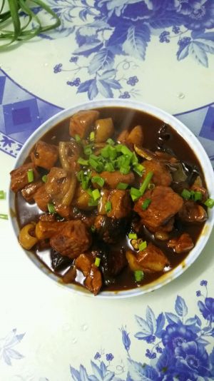 关火出锅,在菜肴上方点缀一丢丢葱丝,给酱香四溢的红烧肉增添一丝小清新。肉,肥而不腻,土豆,软糯香甜,让你的嘴巴根本停不下来。