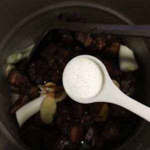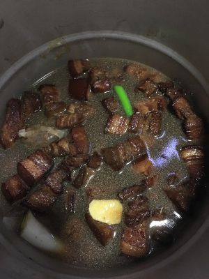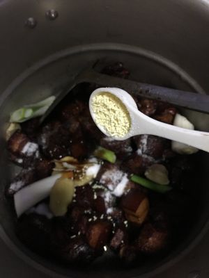 肉煸炒好以后,锅里煸出的油倒出来,然后加入炖肉用的配料,和肉一起炒出香味,加入糖色,翻炒均匀,上色,如果颜色不够,可以再适当加点老抽增色,翻炒均匀加入煮肉的汤,没过肉1厘米,等汤汁烧开后,转入电饭煲,煮粥煲汤功能小火炖煮1小时(炖30分钟后看看肉的软烂程度,还有水量情况,搅动一下,防止上下受热不均匀,防止下层糊底。软烂程度看个人口味而定,炖煮还不是最后一步,把握软烂程度时要预留时间出来,后续还要倒入炒锅大火收汁,倒入炒锅收汁的过程中可以顺便将炖肉的佐料清理出来,这样吃的时候就不会形象口感了。