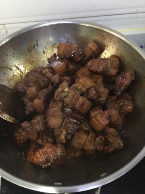 冰糖炒制黑褐色后放入煮好的肉(切块后冷水下锅,去掉浮沫,煮到透亮便可)