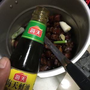 放入高压锅内,加热水与肉相等,不要过多、加入蚝油