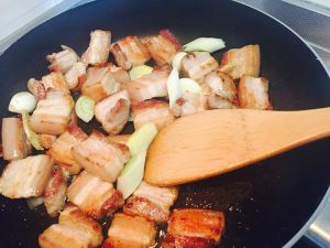 把水倒掉,洗好锅子擦干,放冰糖5个,全部变成焦糖色放肉翻滚