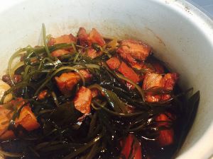 喜欢什么配料,这时可以放进去,我放了一点海带丝。也可以放鹌鹑蛋啦,土豆啦之类的。