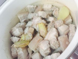 在超市买了两条五花肉,一共600g,帮忙切成了块。回家清洗干净,冷水下锅,放姜片和料酒,煮沸。开着锅盖煮,方便猪腥味飘散在空中,走远走远~~~